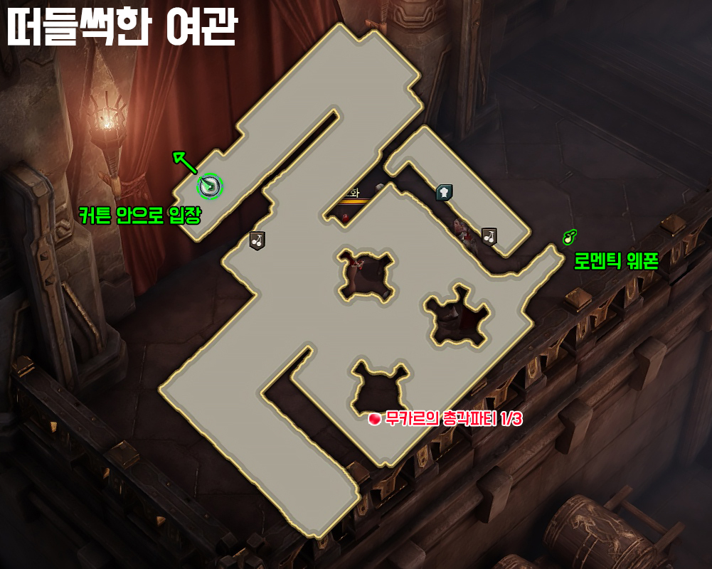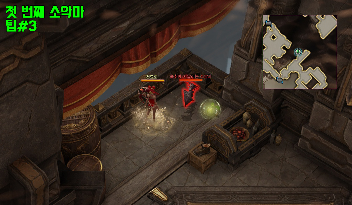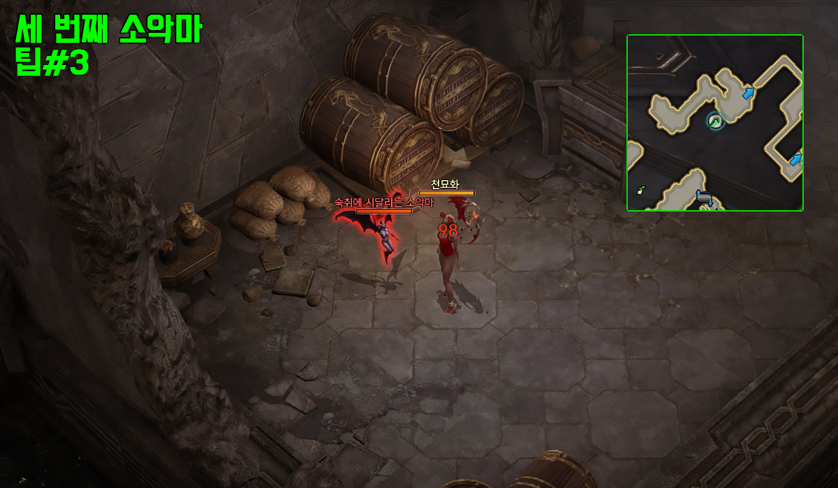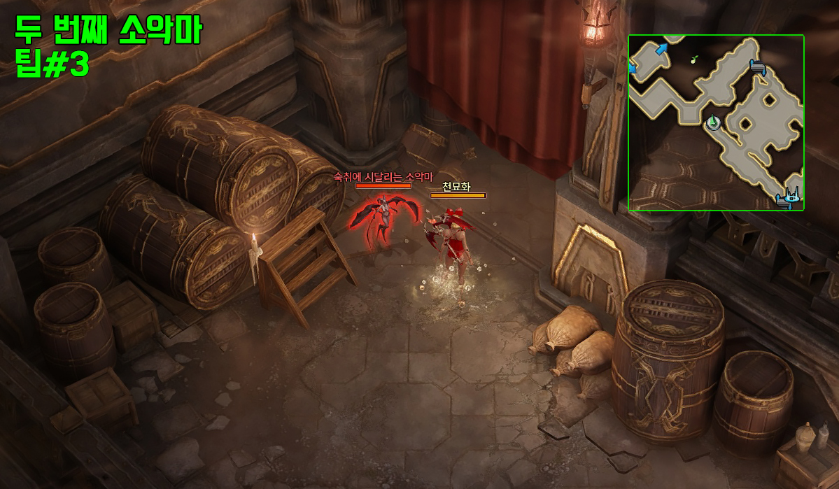 모든 오브젝트(술통, 바리게이트 등) 파괴 및 숨어있는 소악마 3마리를 처치해야 벽 안쪽으로 이동이 가능합니다.